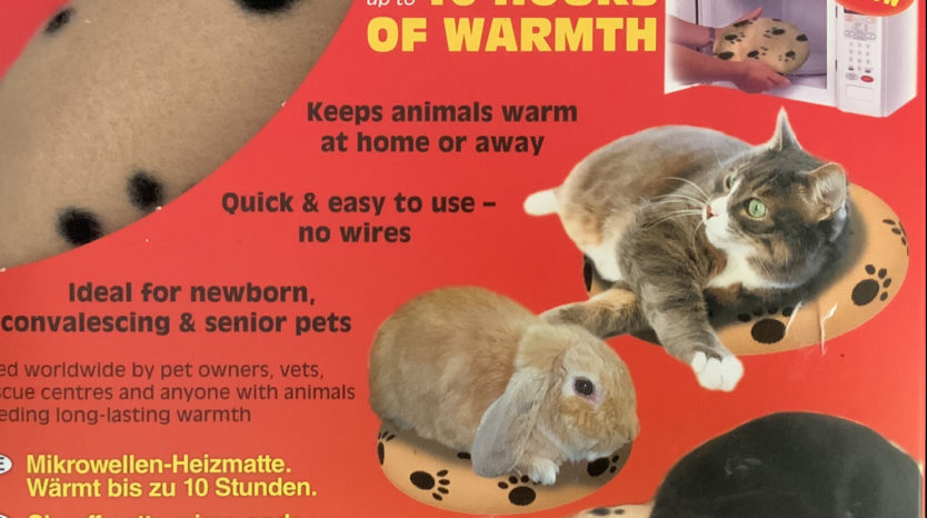 Microwave heatpad. Provides up to 10 hours of long-lasting warmth. Quick and safe. No wires; bite resistant. Perfect travel companion. Ideal for newborn, convalescing and elderly pets.